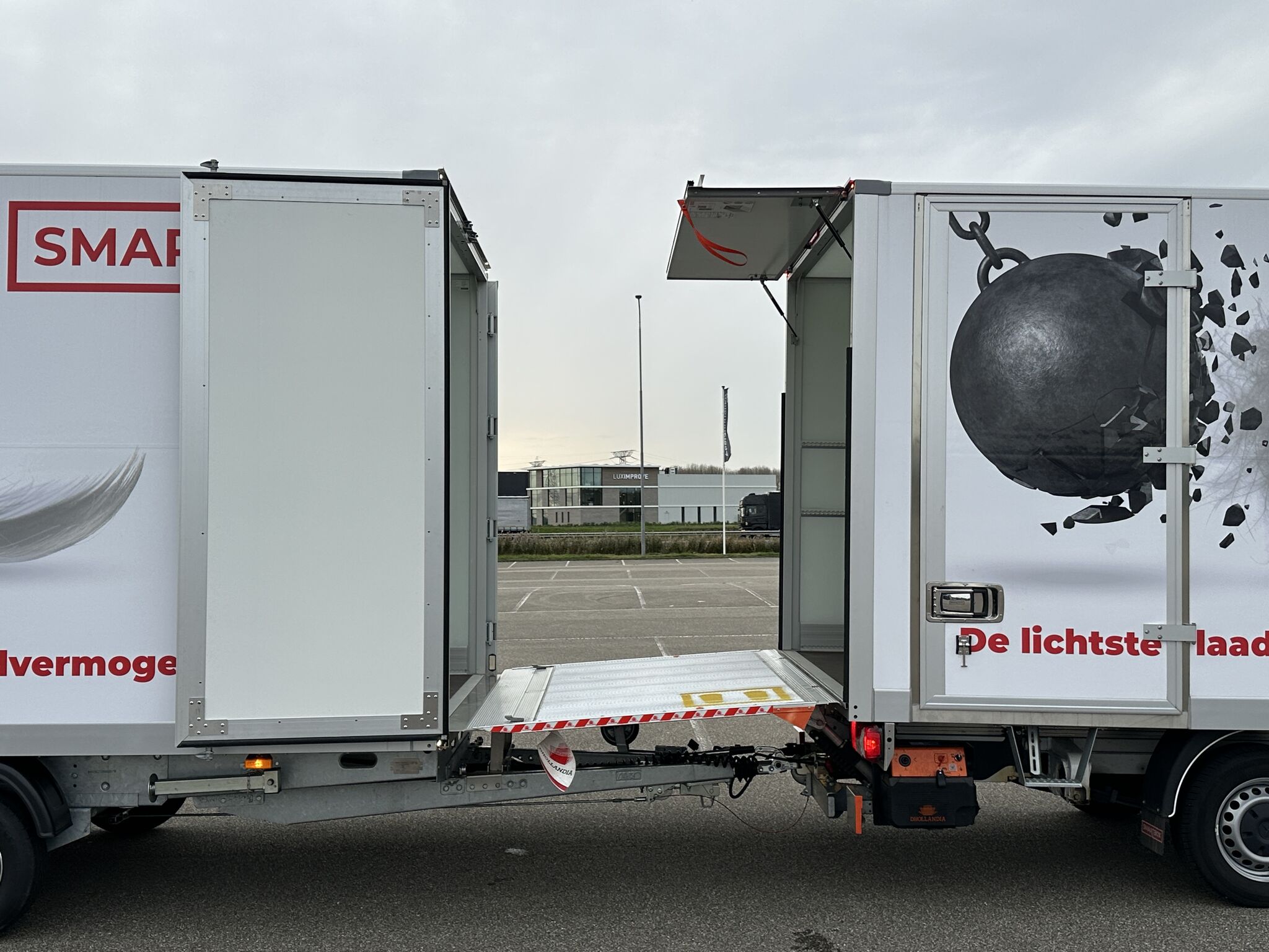 Vanaf heden direct leverbaar voor € 22.400,00 excl. BTW voor de uitvoering zoals op de foto’s (zonder stickers). Uiteraard kunnen de meeste opties achteraf nog gemonteerd worden. Vanwege deze combinatie ideaal voor het vervoer van pallets/zware goederen met een bakwagen ervoor, ook voor de verhuur van apparatuur of andere zaken kan de Smartbox Light Plus ingezet worden vanwege de accu die de laadklep ‘stand-alone’ laat draaien.